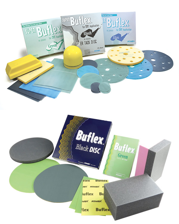 Utilizing state of the art "Roller Coating" technology, abrasive grains are distributed in the most uniform fashion possible. Problems of reappearing scratches, if any, originally made by wet-sanding paper or rubbing compound can be prevented by utilizing Buflex system.